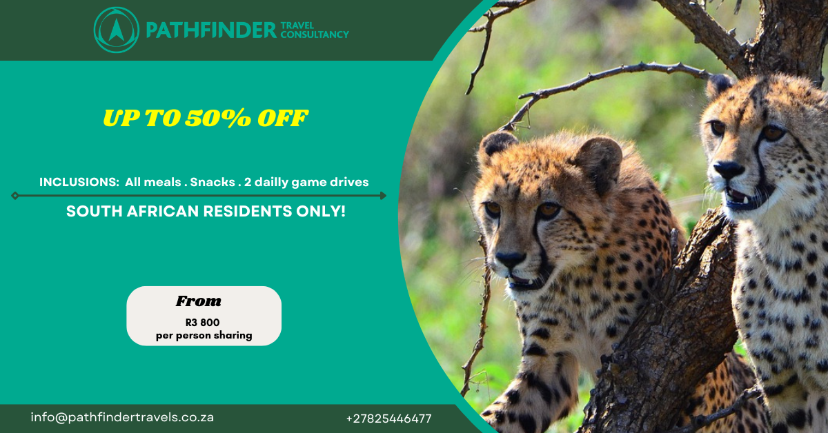 Benefit on specials up to 50% off, whether you are looking to travel to Kruger national park and other reserves in the country, or skip over to Chobe and Okavango Delta in Botswana, Victoria Falls in Zimbabwe, Serengeti and Ngoro Ngoro in Tanzania, Masai Mara in Kenya…not leaving behind beach getaways in the country, Zanzibar, Vilanculos in Mozambique!